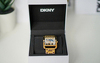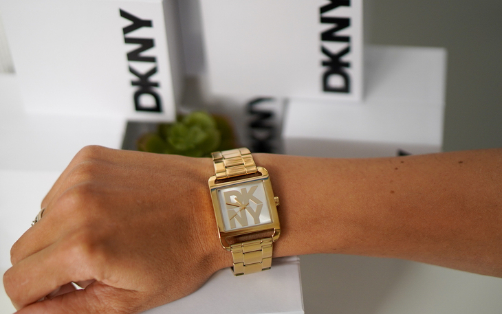 Ein besonderes Designelement ist das silberfarbene Zifferblatt, das mit einem großen, goldfarbenen DKNY-Logo als auffälliges und klares Mode-Statement veredelt wurde. Die klaren, goldfarbenen Block-Zeiger setzen einen stilvollen Kontrast und sorgen für eine mühelose Ablesbarkeit.