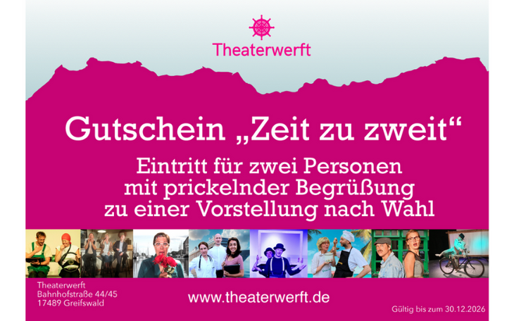Eintritt für zwei Personen mit prickelnder Begrüßung zu einer Vorstellung nach Wahl in der Theaterwerft Greifswald.