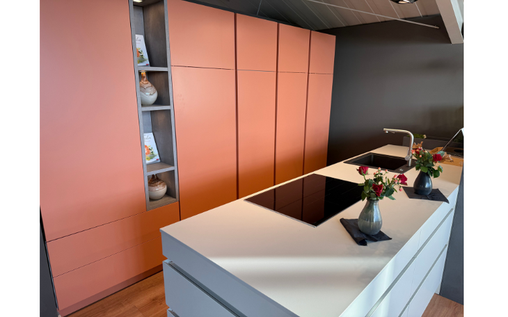 Die edle Front in Mohair harmoniert perfekt mit den Farbtönen Les Couleurs® – 028 terre sienne brique und Platin – eine Kombination, die Wärme, Stil und Modernität vereint.