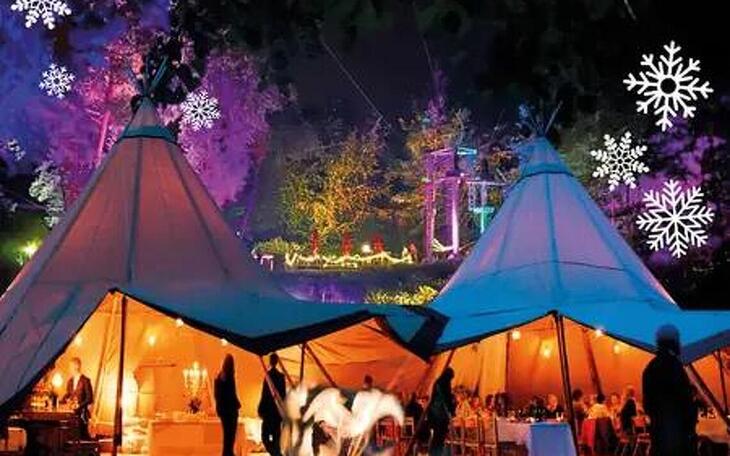 Stellt euch vor: Ein festlich geschmücktes Event-Tipi mit knisterndem Feuer, Lichterglanz und gemütlicher Wärme wird euer Wohnzimmer im Wald.